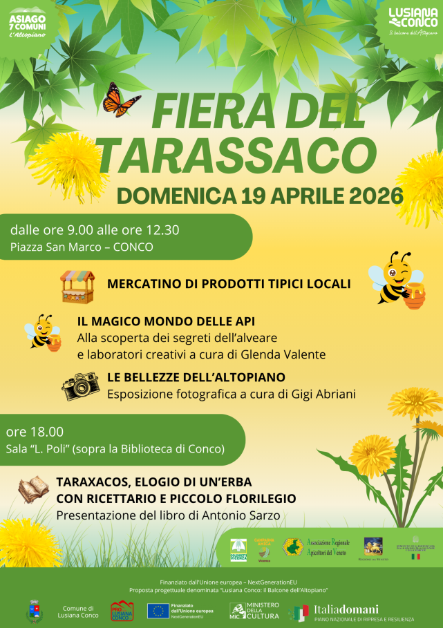 Alle ore 18.00, presso la Sala “L. Poli”, sopra la Biblioteca di Conco, Antonio Sarzo presenterà il suo libro dedicato al tarassaco, “Taraxacos, elogio di un’erba con ricettario e piccolo florilegio”.