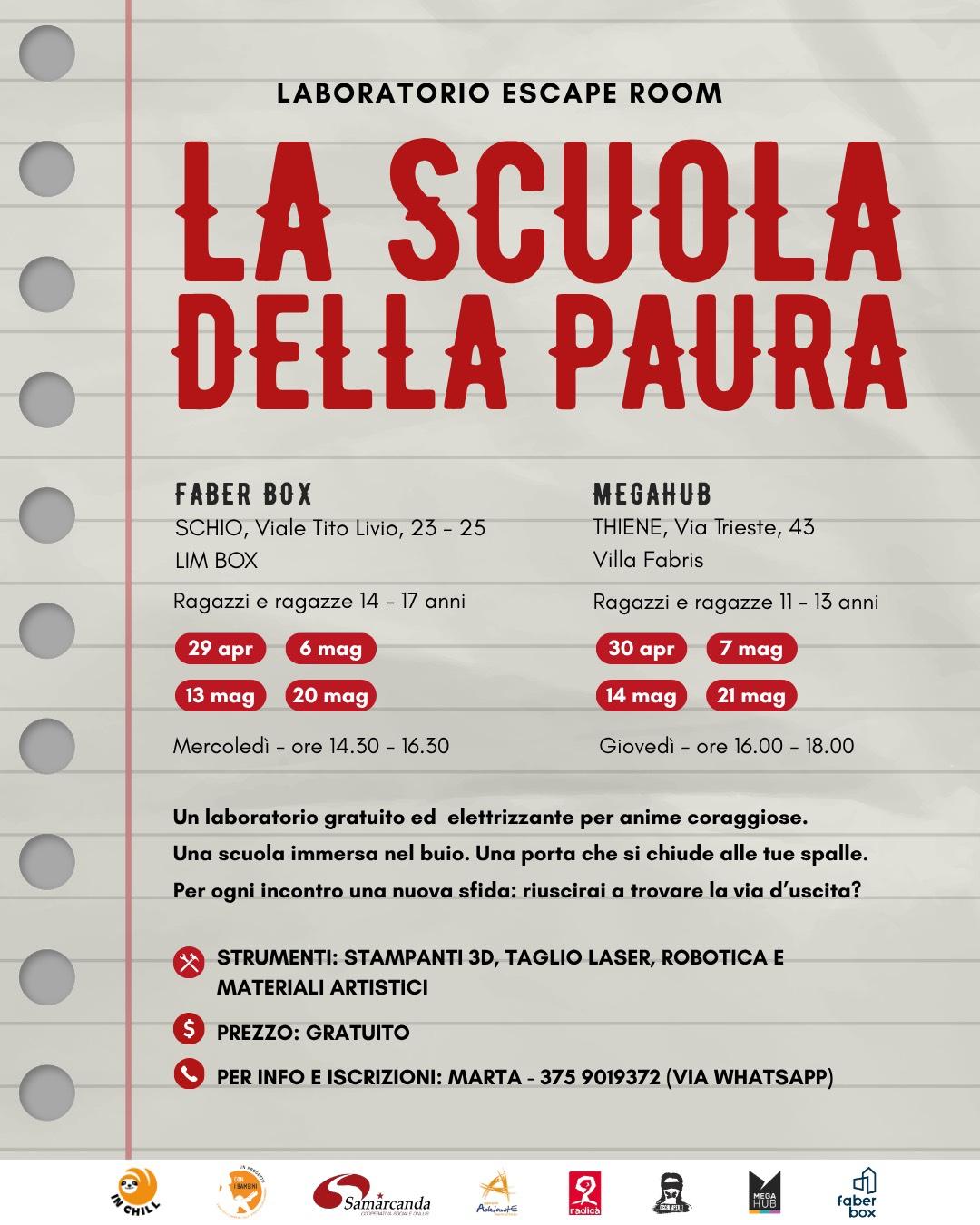 A partire da mercoledì 29 aprile 2026 fino a giovedì 21 maggio 2026, ci saranno una serie di laboratori gratuiti Escape Room (con stampanti 3D, taglio laser, robotica e materiali artistici) presso le sedi di Schio e Thiene le quali, alterneranno gli incontri: Faber Box (Schio) e Megahub - Villa Fabris (Thiene).