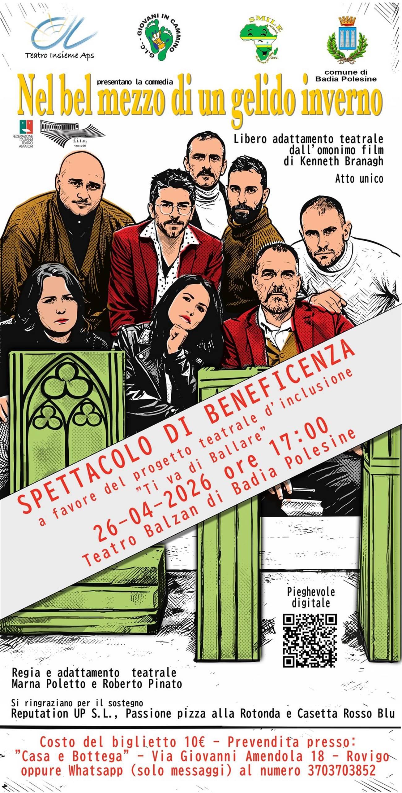 Domenica 26 aprile 2026 alle ore 17.00 presso il Teatro Sociale Balzan di Badia Polesine, la compagnia "Teatro Insieme Aps" di Sarzano (RO), metterà in scena "Nel bel mezzo di un gelido inverno", tratto dall'omonimo film di Kenneth Branagh e liberamente adattato in un unico atto, con la regia di Marna Poletto e Roberto Pinato.