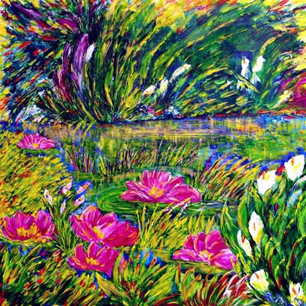 Fiori dalle corolle appariscenti tra il fogliame carnoso che esibisce svariate intensità di verdi, acque che baciano sponde o rive erbose che ci fanno immaginare creature nascoste, sono i soggetti di questa mostra che molto richiama il giardino dell'Eden.