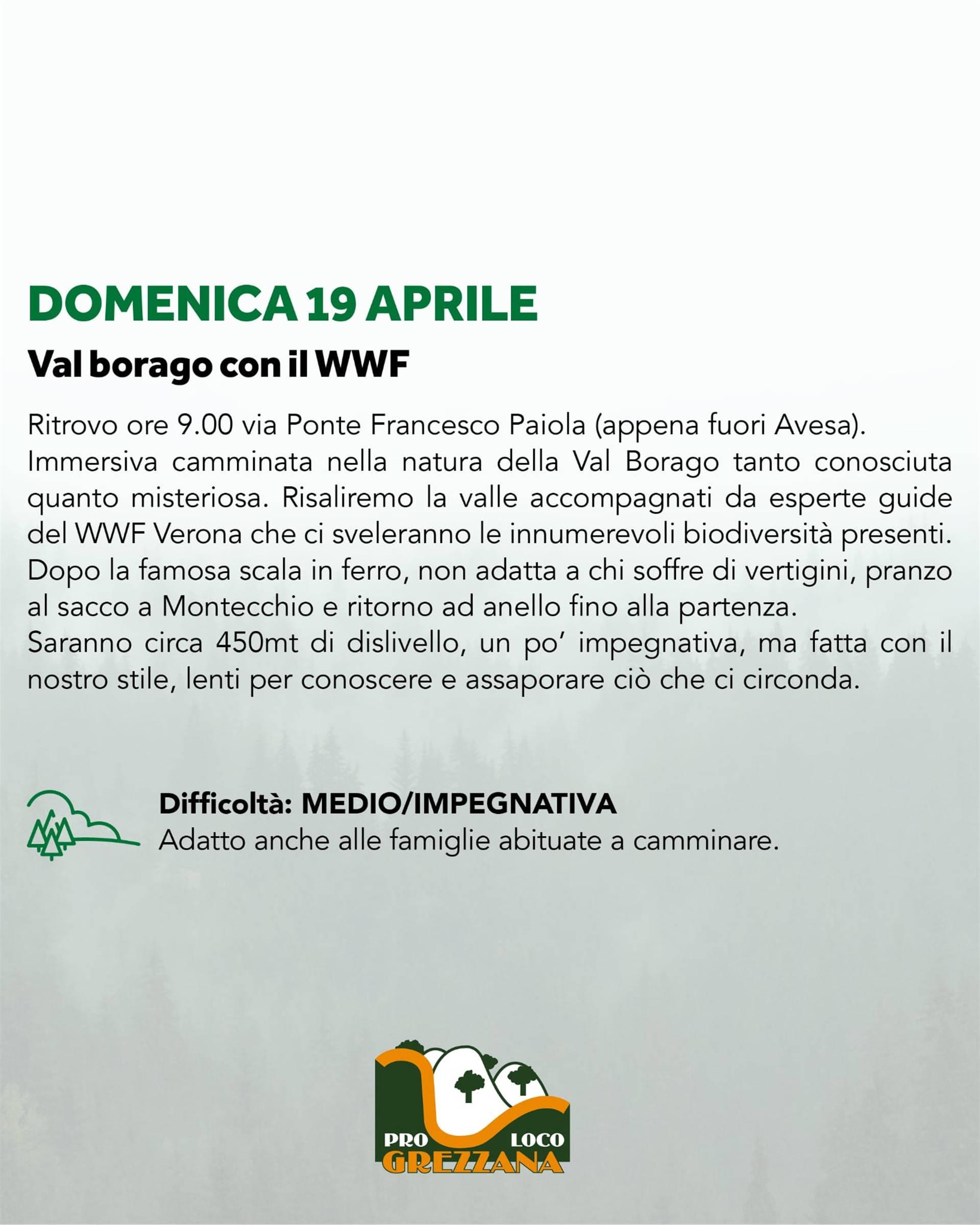 Immersiva camminata nella natura della Val Borago tanto conosciuta quanto misteriosa. Risaliremo la valle accompagnati da esperte guide del WWF Verona che ci sveleranno le innumerevoli biodiversità presenti. Dopo la famosa scala in ferro, non adatta a chi soffre di vertigini, pranzo al sacco a Montecchio e ritorno ad anello fino alla partenza.