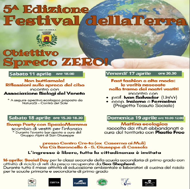 Il Comune di Cassola, in occasione della Giornata mondiale della Terra celebrata in tutto il mondo il 22 aprile, dà avvio il prossimo 11 aprile alla quinta edizione del Festival della Terra con un ciclo di quattro eventi sulla sostenibilità ambientale e la salvaguardia del nostro pianeta. In particolare quest'anno l'attenzione sarà rivolta alle buone pratiche per evitare lo spreco, sia in campo alimentare che nella produzione tessile.