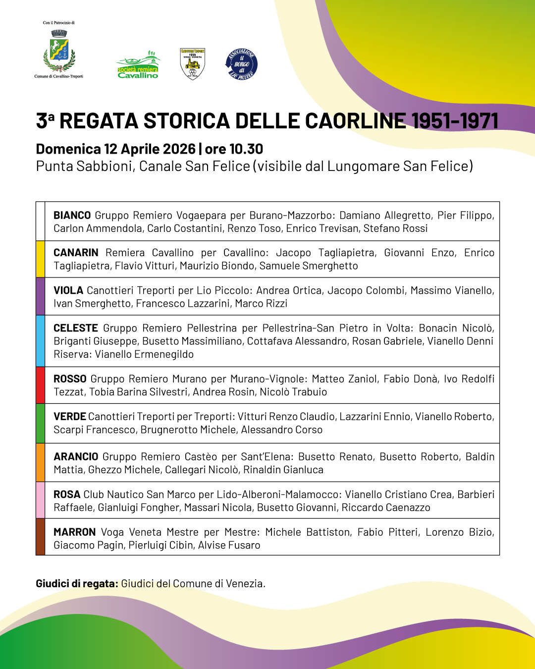 La manifestazione coinvolge campioni del passato, giovani promesse e numerosi ospiti, uniti nel ricordo di un’epoca in cui Lio Piccolo, Treporti e Cavallino dominarono la Regata Storica delle Caorline, collezionando ben 12 vittorie in 14 anni: 8 per Lio Piccolo, 3 per Treporti e 1 per Cavallino.