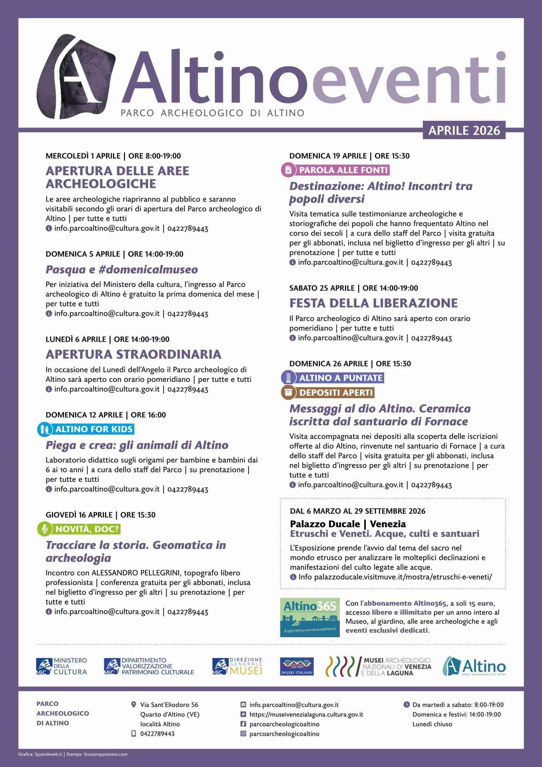 · domenica 26 aprile, alle ore 15:30, Messaggi al dio Altino. Ceramica iscritta dal santuario di Fornace, visita guidata gratuita per gli abbonati, inclusa nel biglietto d’ingresso per gli altri, a cura dello staff del Parco, su prenotazione; Fuori Museo:
