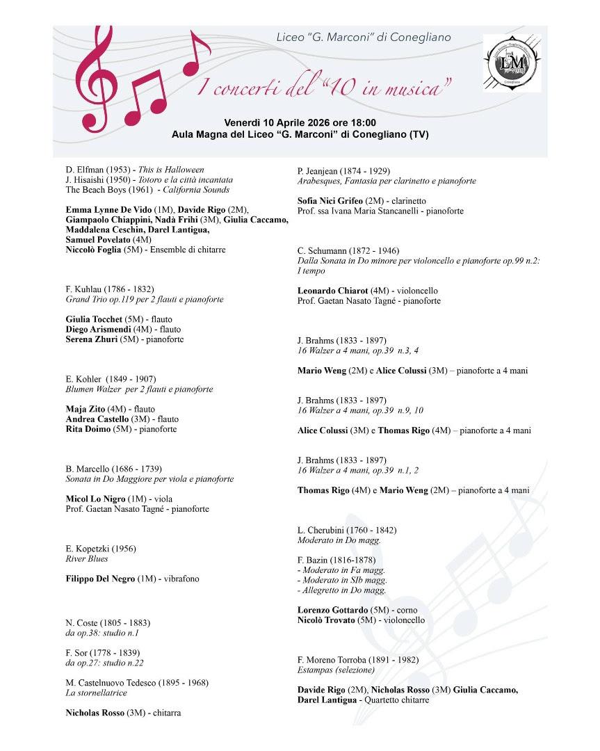 Venerdì 10 aprile alle ore 18:00 presso l'Aula Magna dell'Istituto, si terrà il quarto concerto con musiche di Brahms e molti altri.