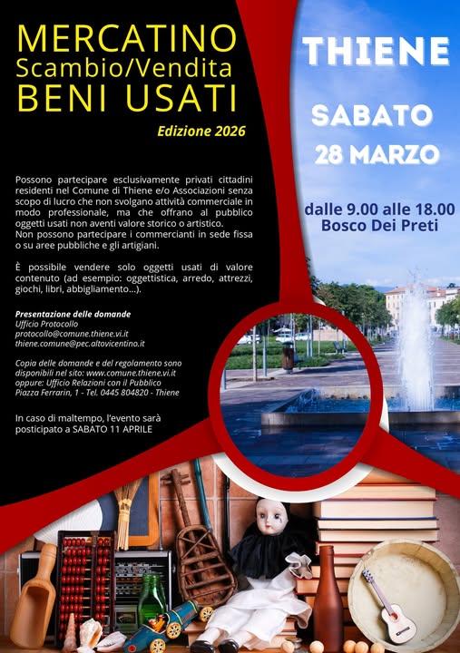 Sabato 28 marzo 2026, si terrà, dalle ore 9:00 alle ore 18:00, presso il Bosco dei Preti a Thiene, il Mercatino scambio/vendita dell'usato, organizzato dal Comune di Thiene.