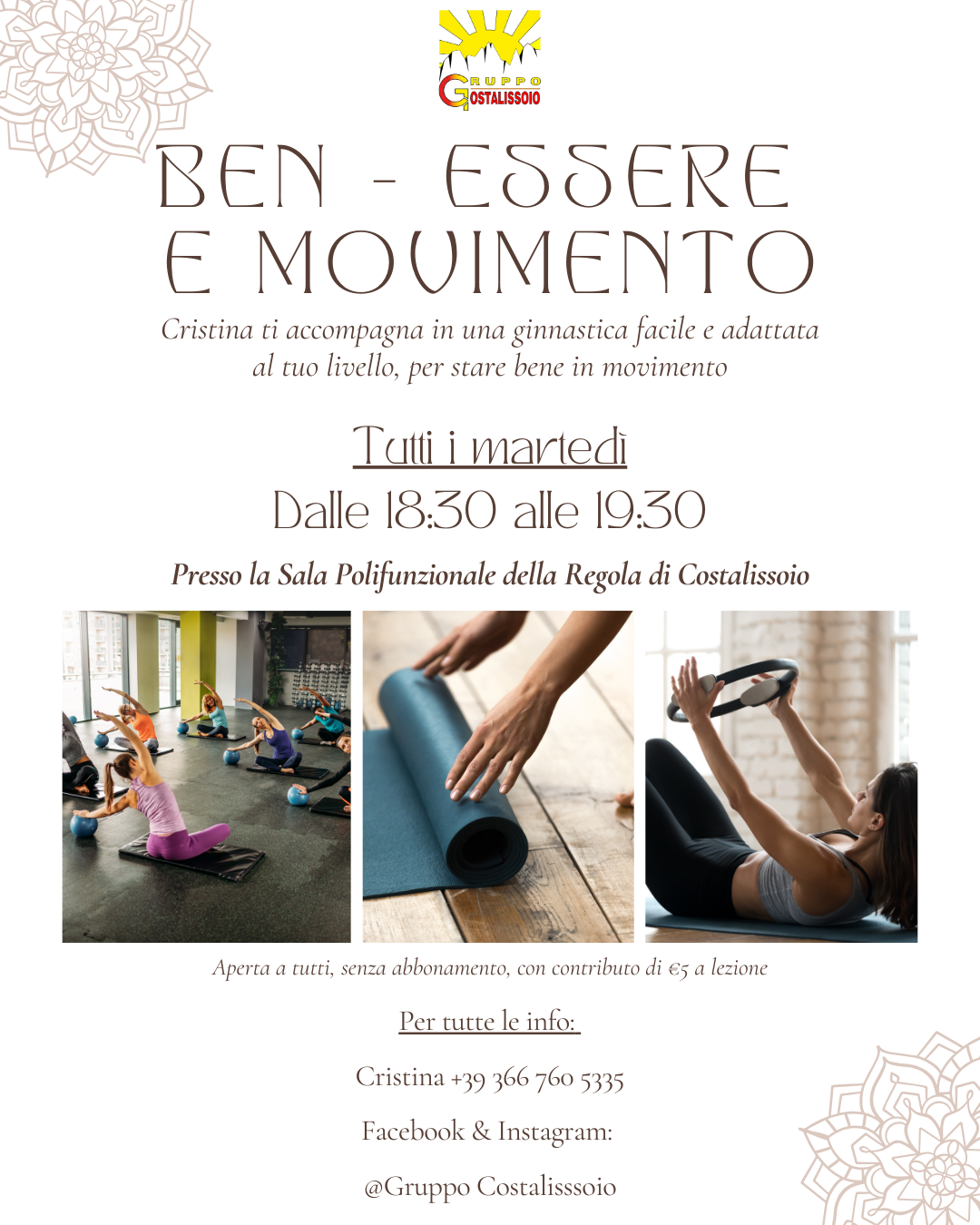 Un'ora tutta per te, per muoverti e sentirti meglio. Aperta a tutte le età e livelli. Cristina ti segue passo dopo passo con esercizi personalizzati, pensati per le esigenze di ognuno.