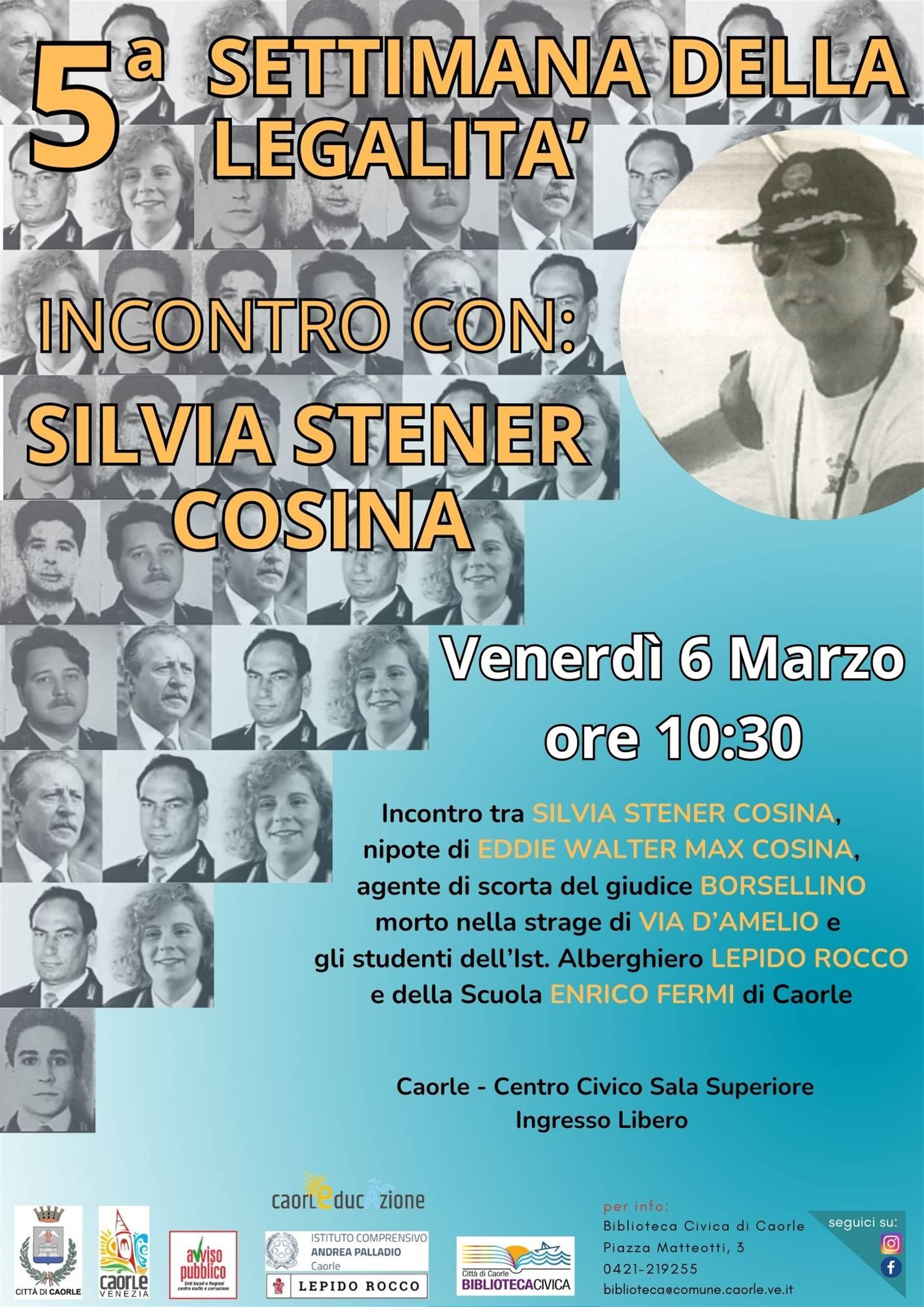 In programma l’incontro con Silvia Stener Cosina, nipote di Eddie Walter Max Cosina, agente di scorta del magistrato Paolo Borsellino, che il 19 luglio 1992, insieme ad altri colleghi, fu ucciso nella strage di via d’Amelio a Palermo. Silvia tiene viva la memoria di quanto accaduto, per restituire dignità alle vite spezzate e trasformare quella tragica storia in memoria collettiva.