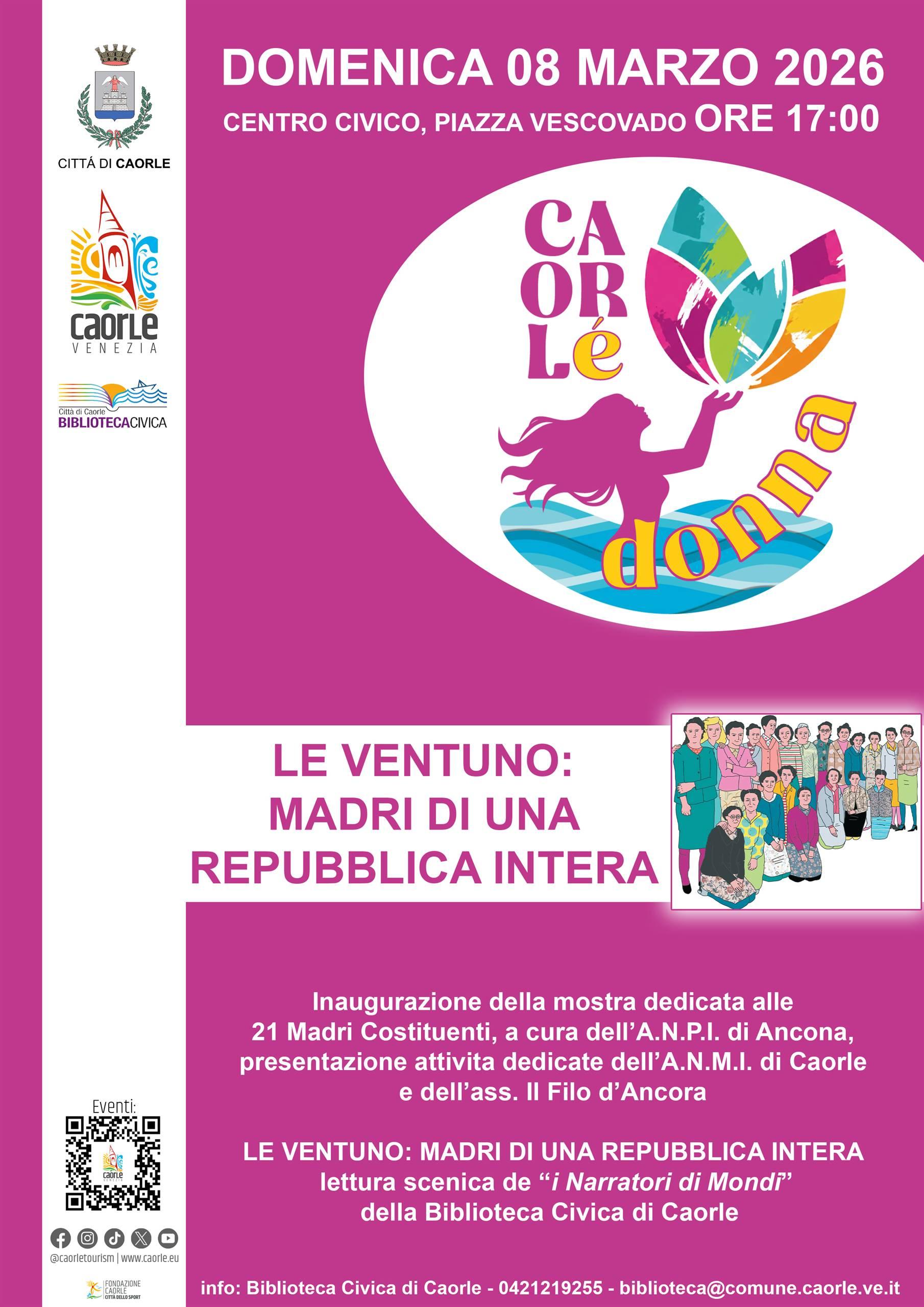 Inaugurazione della mostra dedicata alle 21 Madri Costituenti a cura dell’A.N.P.I. di Ancona e a seguire: “Le Ventuno: Madri di una Repubblica Intera”: lettura scenica de I Narratori di Mondi della Biblioteca Civica di Caorle.