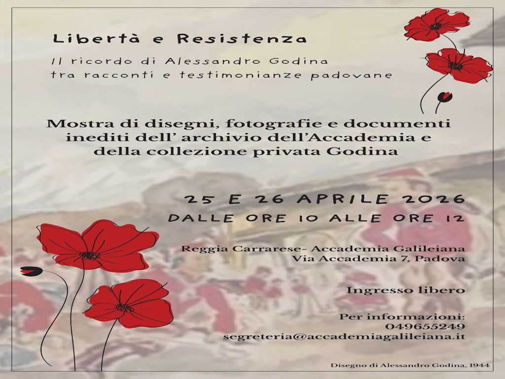 Mostra di disegni, fotografie e documenti inediti dell'archivio dell'Accademia e della collezione privata Godina, che si terrà sabato 25 e domenica 26 aprile 2026 dalle ore 10 alle ore 12 presso la sala del Guariento della Reggia Carrarese.