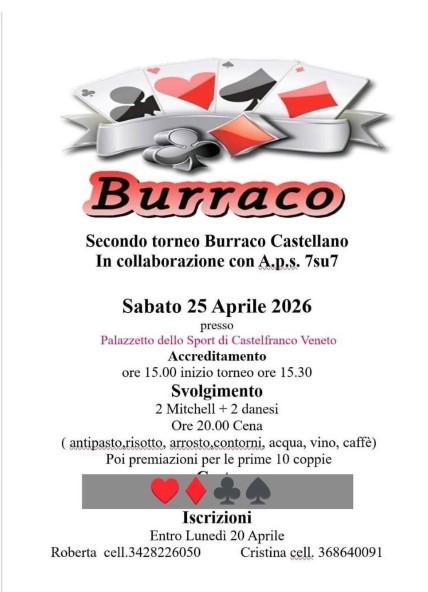 Sabato 25 aprile 2026, il Palazzetto dello Sport di Castelfranco Veneto ospiterà il Secondo Torneo Burraco Castellano, un evento organizzato in collaborazione con l'A.p.s. 7su7.