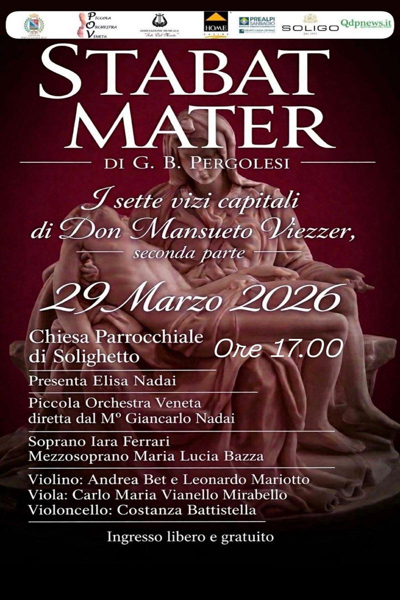 Nel cuore del periodo pasquale, lasciatevi trasportare da un’esperienza sonora e spirituale di rara intensità. Questo appuntamento unico celebra il connubio tra la grande tradizione sacra del Settecento e la sensibilità contemporanea, offrendo al pubblico un momento di profonda introspezione e bellezza artistica. Il programma si apre con le sublimi note dello Stabat Mater di G. B. Pergolesi, capolavoro assoluto dell’arte barocca capace di dare voce al dolore e alla speranza universale, per poi proseguire con l’emozionante seconda parte de I sette vizi capitali di Don Mansueto Viezzer.