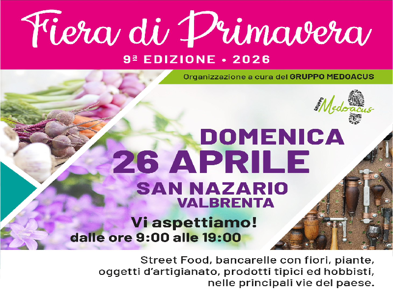 Il Gruppo Medoacus non perde l'occasione per ricordare l'appuntamento di DOMENICA 26 APRILE 2026, con la "FIERA DI PRIMAVERA" a San Nazario - Valbrenta (VI).