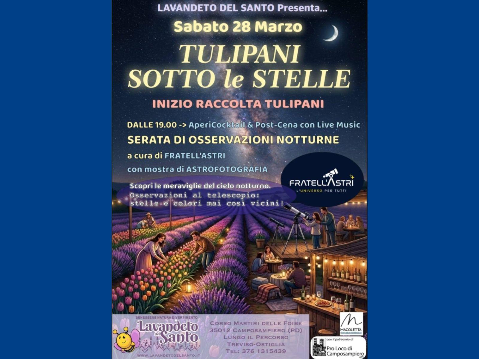 Sabato 28 marzo, presso il Lavandeto del Santo a Camposampiero, si terrà l’evento "Tulipani sotto le stelle". L'iniziativa celebra ufficialmente l'apertura della stagione di raccolta dei tulipani, coniugando la bellezza naturalistica del luogo con il fascino dell'astronomia.