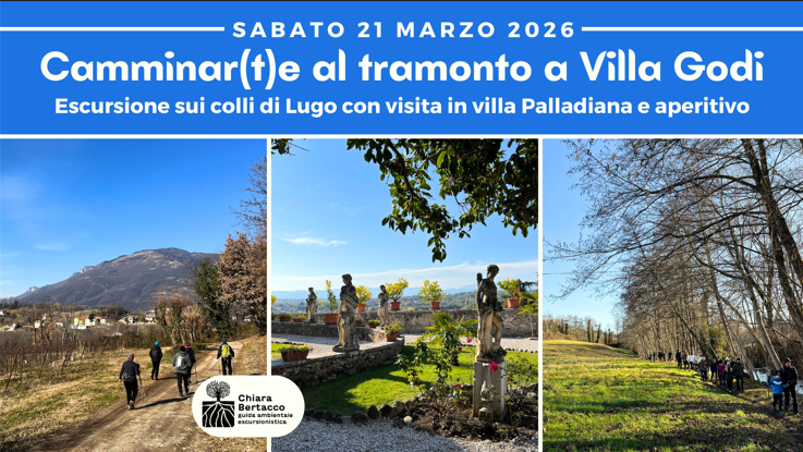 Sabato 21 marzo 2026 dalle 14.30, Chiara Bertacco Guida Ambientale Escursionistica, organizza, in collaborazione con Villa Godi Malinverni, la camminata Camminar(t)e al tramonto a Villa Godi a Lugo di Vicenza.