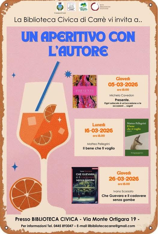 La Biblioteca Civica di Carrè ha organizzato nel mese di marzo tre incontri a tema Un aperitivo con l'autore.