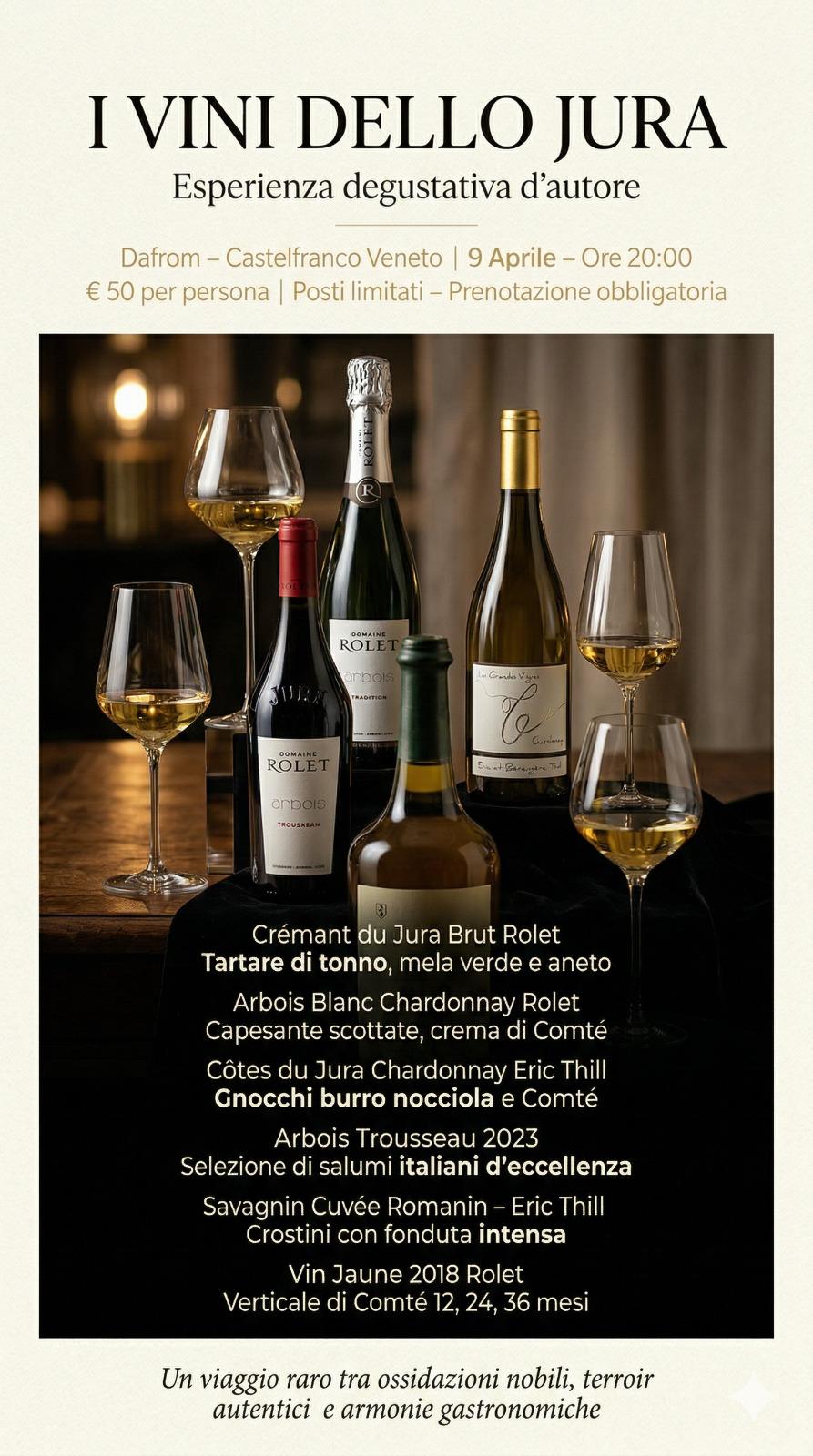 Giovedì 9 aprile, Dafrom vi invita a scoprire un angolo di Francia lontano dai circuiti convenzionali con una serata interamente dedicata allo Jura, regione celebre per la sua straordinaria identità vitivinicola.