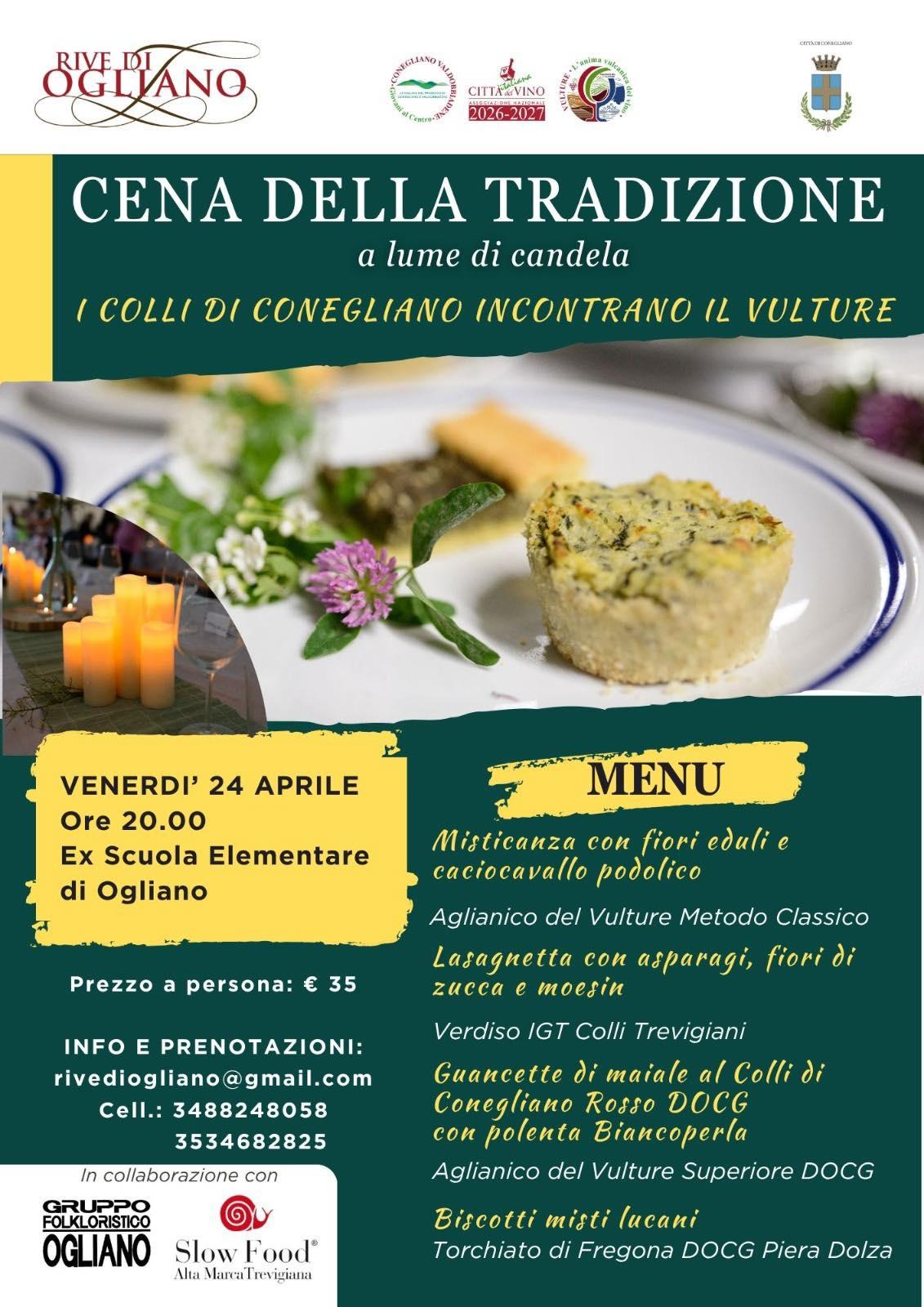 La Pro Loco di Ogliano, in collaborazione con il Gruppo Folkloristico Ogliano e Slow Food Alta Marca Trevigiana, propongono la speciale Cena della Tradizione a lume di candela. L’iniziativa, inserita nel contesto delle celebrazioni per la Città Italiana del Vino 2026-2027, si terrà venerdì 24 aprile alle ore 20.00 presso i locali dell'Ex Scuola Elementare di Ogliano.