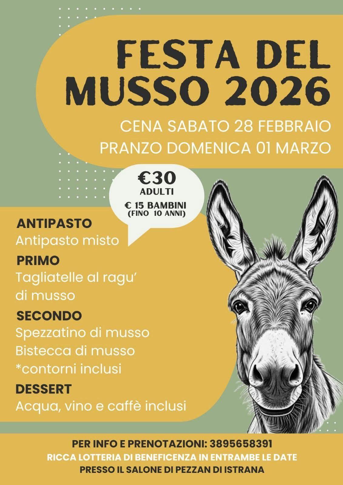 La tradizionale Festa del Musso torna a Pezzan di Istrana con un appuntamento dedicato alla convivialità e alla cucina tipica locale. L’iniziativa si svolge Sabato 28 febbraio con la cena e Domenica 1 marzo con il pranzo, proponendo un menù a base di specialità preparate secondo la tradizione e momenti di incontro per la comunità.