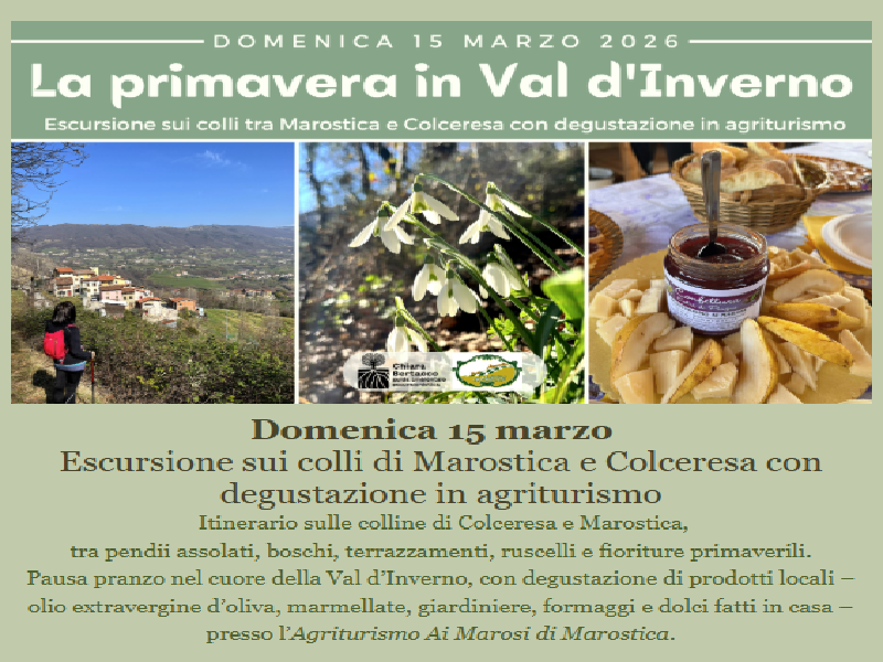Pausa pranzo nel cuore della Val d’Inverno, con degustazione di prodotti locali – olio extravergine d’oliva, marmellate, giardiniere, formaggi e dolci fatti in casa – presso l’Agriturismo Ai Marosi di Marostica.