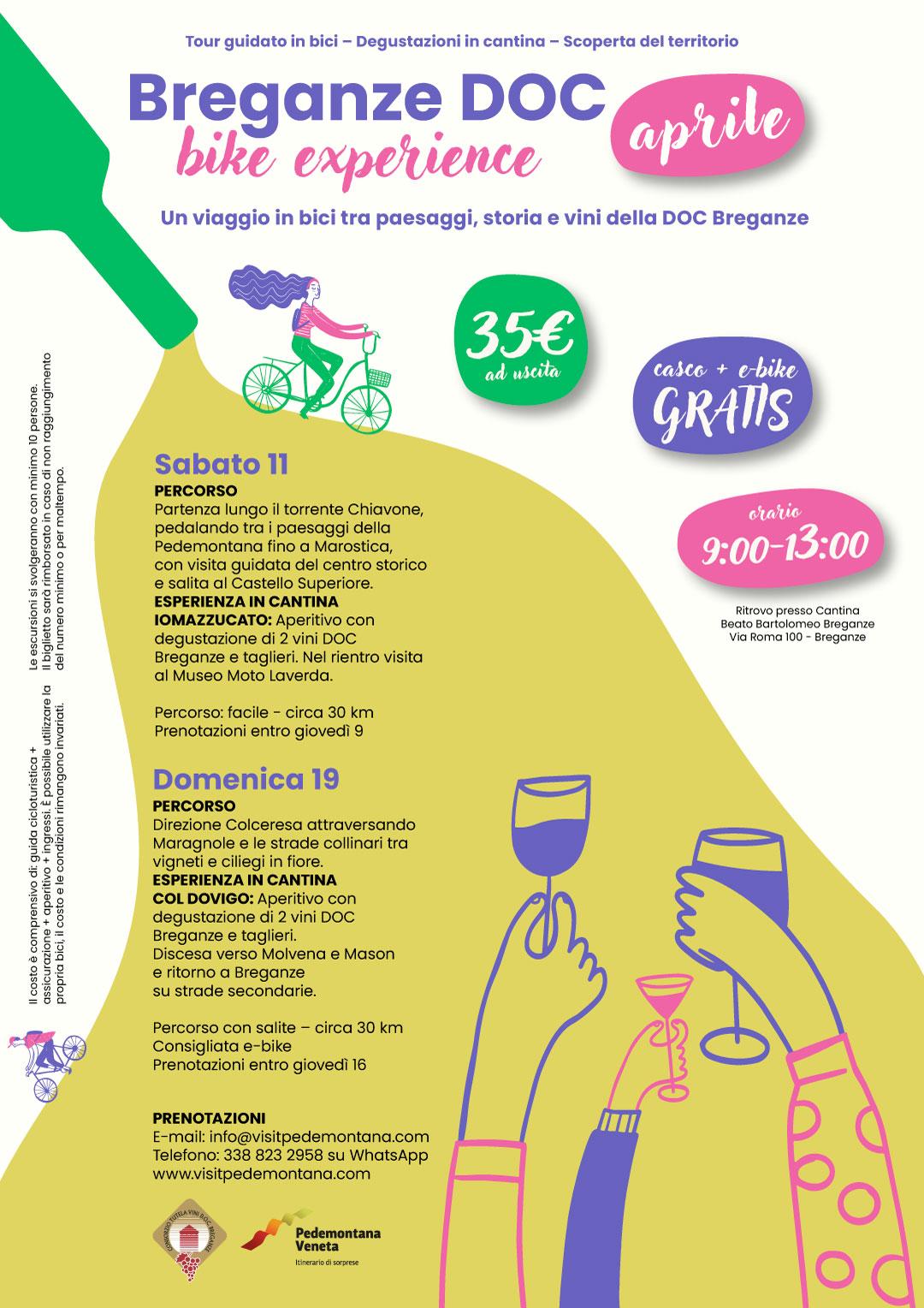 Prenotazione obbligatoria entro le ore 18:00 di giovedì 9 Aprile 2026 al seguente link: https://visitpedemontana.com/prodotto/breganze-doc-bike-experience/?preview_id=9419&preview_nonce=fe8d842ccf&_thumbnail_id=9420&preview=true