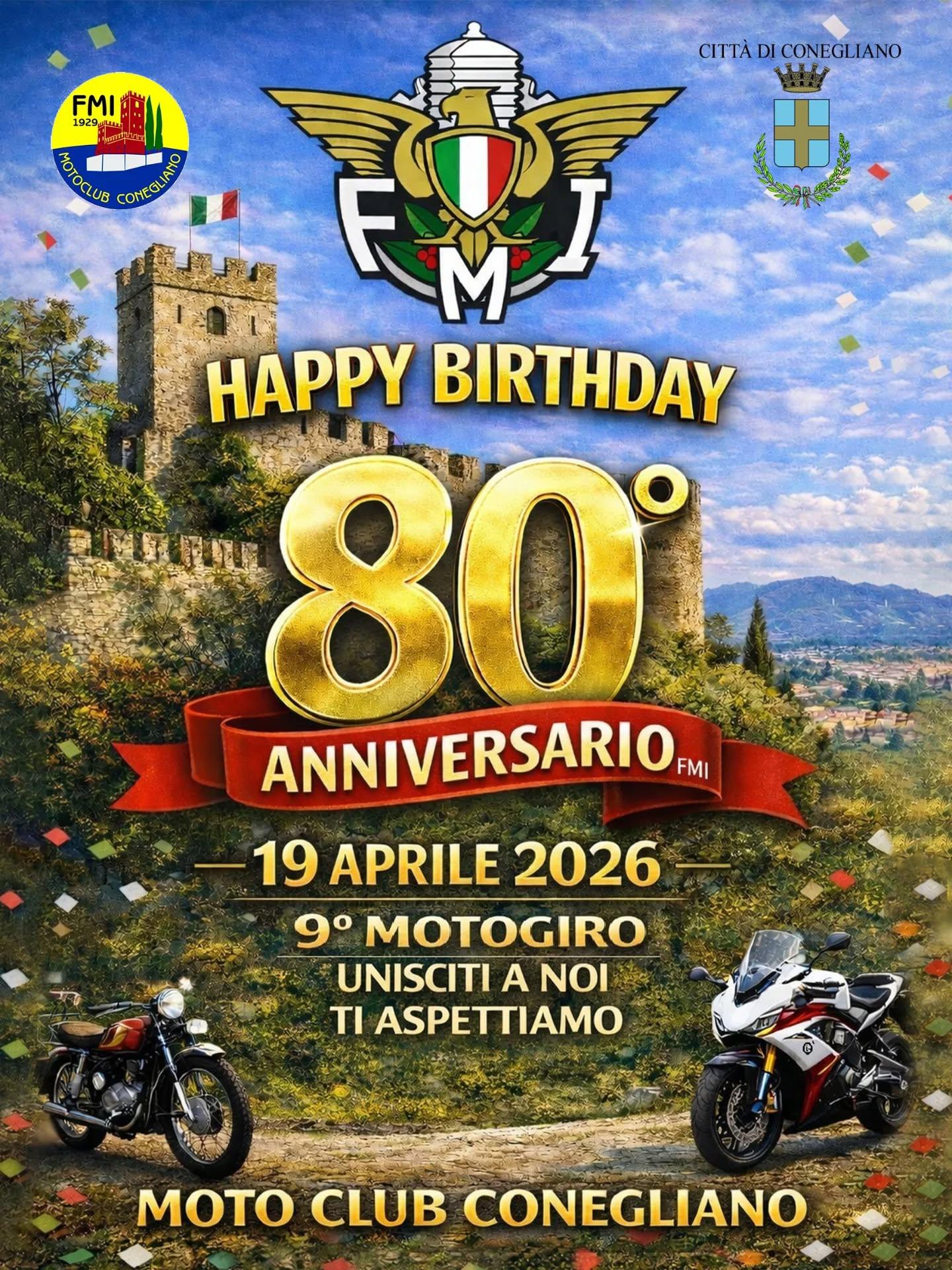 Il Motoclub Conegliano festeggia il suo 80° anniversario di affiliazione alla FMI, con il 9° Motogiro, che si terrà domenica 19 aprile 2026.
