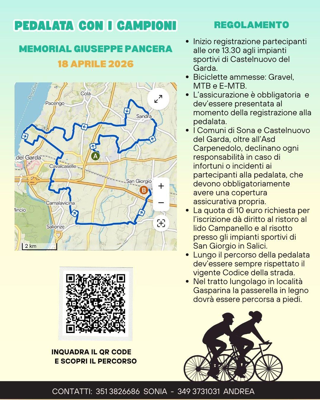 La partenza è prevista da Castelnuovo del Garda alle ore 14:30, con ritrovo e registrazioni a partire dalle 13:30, mentre l’arrivo sarà a San Giorgio in Salici, attraversando un percorso suggestivo che si sviluppa fino all’area del lungolago. L’iniziativa è aperta a MTB, gravel ed e-MTB e non ha carattere competitivo, ma promuove la partecipazione e la condivisione dell’esperienza sportiva.