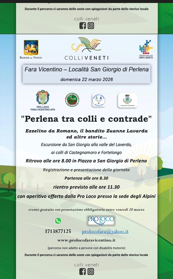 Domenica 22 Marzo 2026, dalle 8:30 alle 11:30 presso San Giorgio di Perlena, nel comune di Fara Vicentino, si terrà l'escursione "Perlena tra colli e contrade", in occasione della Giornata Regionale per i Colli Veneti.