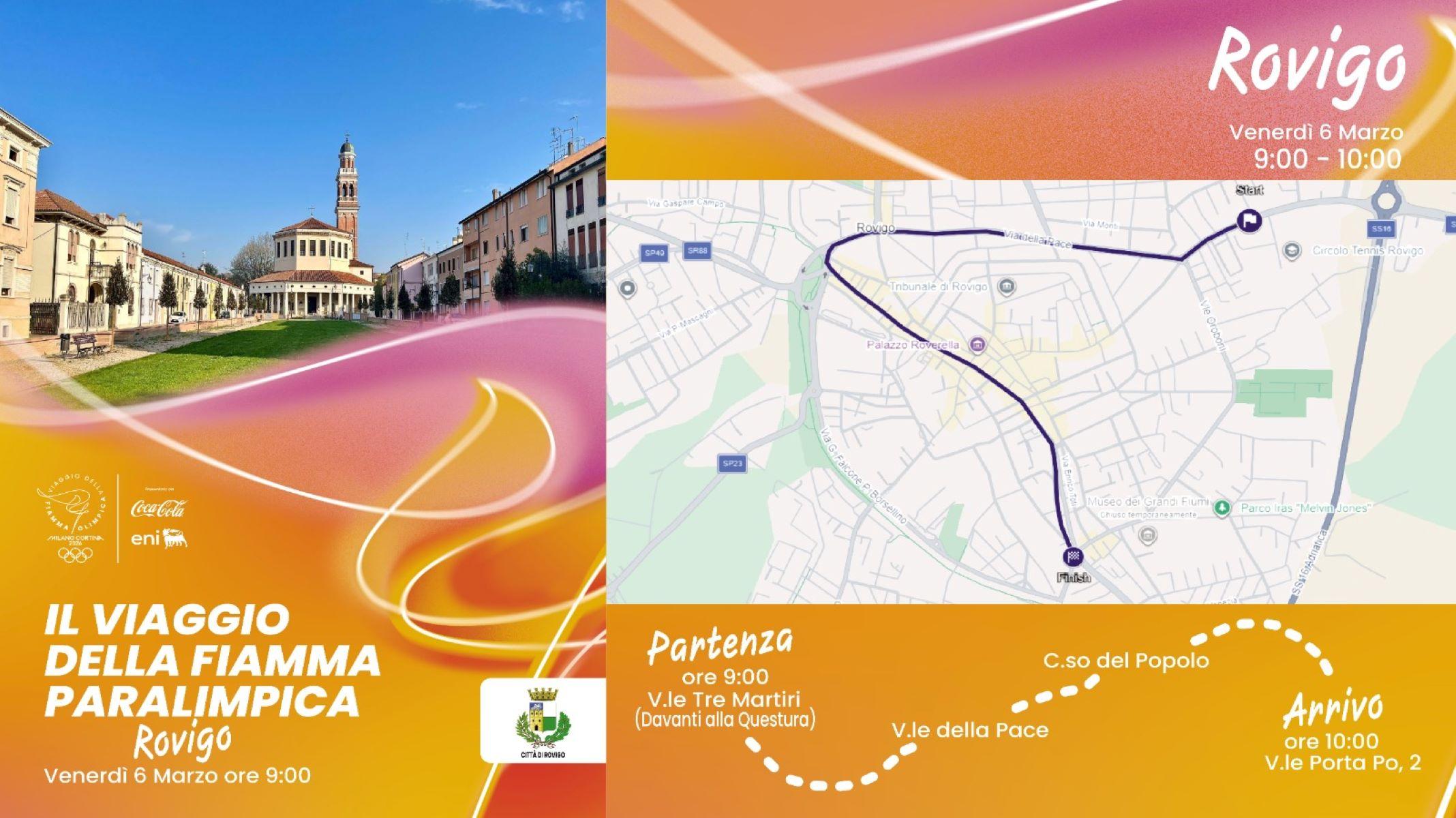 Il Comune di Rovigo è stato scelto come "Comune di passaggio" del viaggio della fiamma paralimpica, che si svolgerà il prossimo venerdì 6 marzo dalle ore 09.00 alle ore 10:00 circa con partenza da Viale Tre Martiri davanti alla Questura, passando poi per Viale della Pace, Viale Dante Alighieri, Corso del Popolo e terminare in Viale Porta Po n. 2.