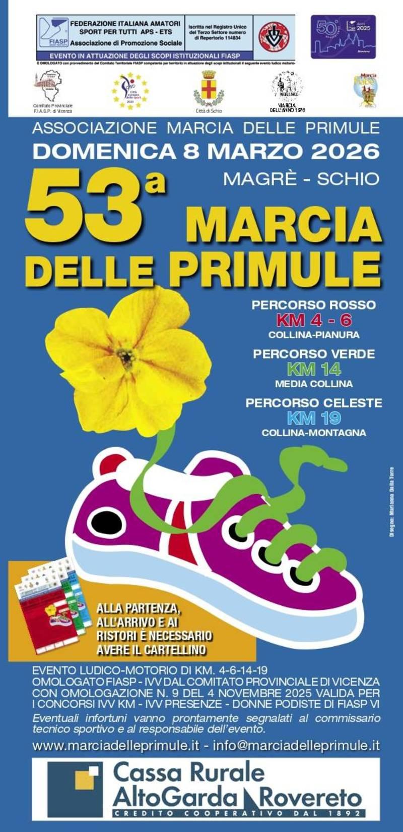 Domenica 8 marzo si terrà la 53^ Marcia delle Primule a Magrè di Schio, organizzata da Associazione Marcia delle Primule con Comitatio Provinciale FIASP di Vicenza, Comune di Schio.