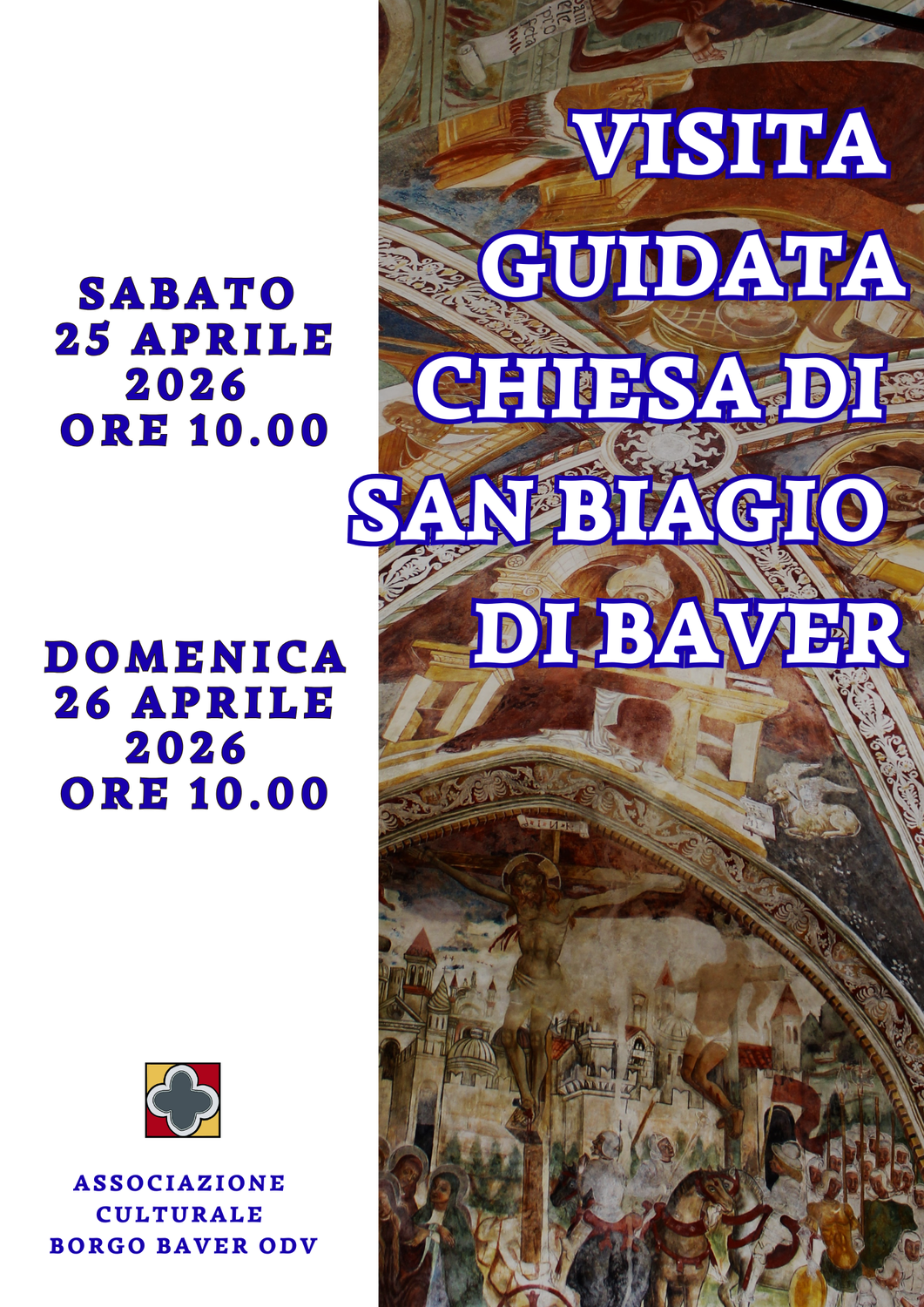 L'Associazione Culturale Borgo Baver ODV organizza due visite guidate agli affreschi della Chiesa medioevale di San Biagio di Baver in località Pianzano, nel Comune di Godega di Sant'Urbano (TV) per sabato 25 Aprile alle ore ore 10.00 e per domenica 26 Aprile sempre alle ore 10.00.