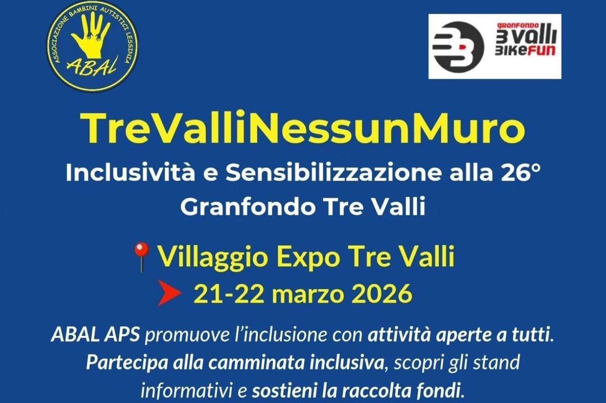 Sabato 21 marzo, in occasione della Granfondo Tre Valli, partecipa alla camminata inclusiva di 3 km, aperta a tutti e gratuita, con il supporto di accompagnatori.