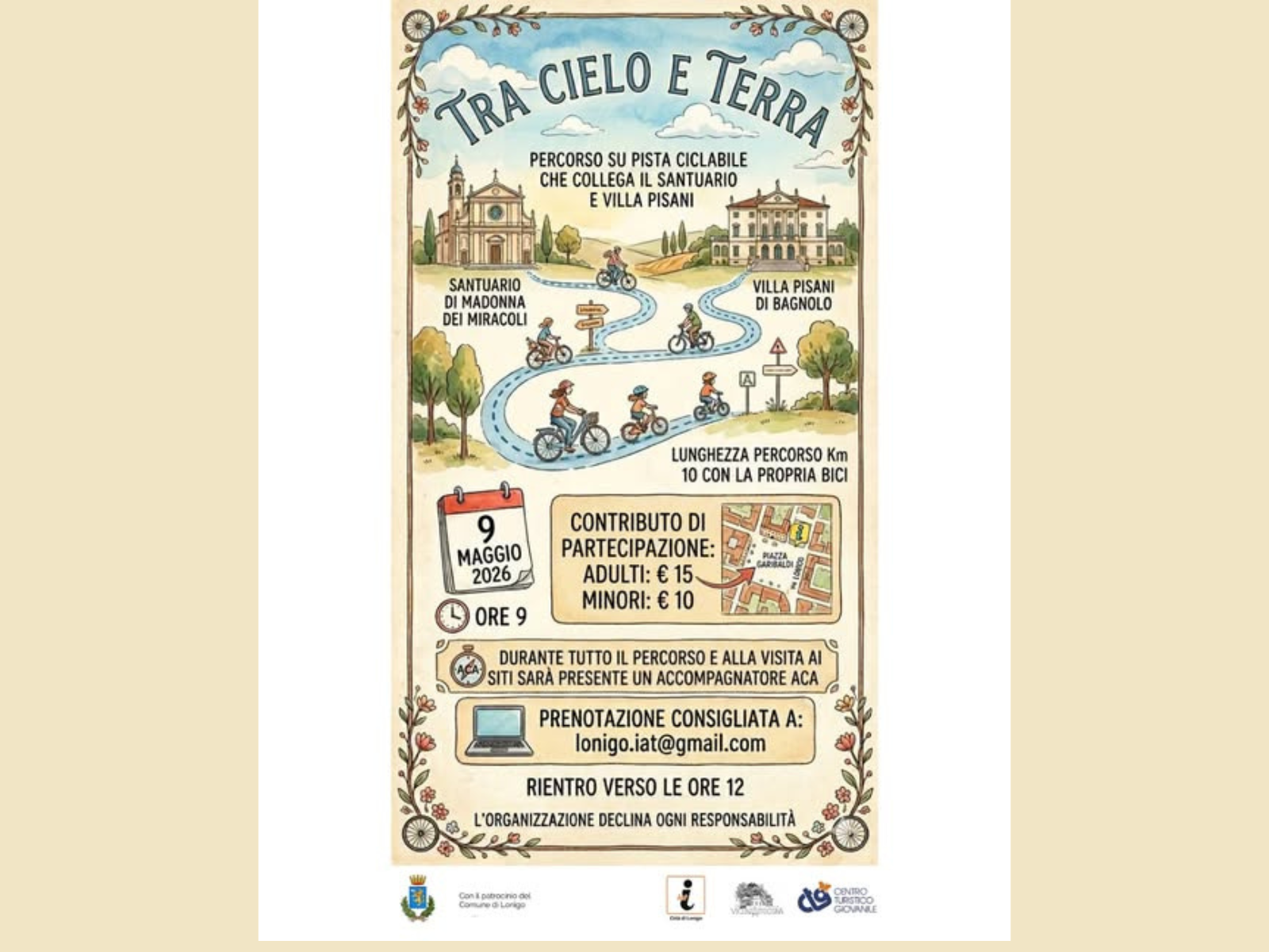 L'evento "Tra Cielo e Terra" propone un percorso ciclabile di circa 10 chilometri che mette in comunicazione due simboli d’eccellenza del vicentino: il Santuario di Madonna dei Miracoli e la maestosa Villa Pisani di Bagnolo.