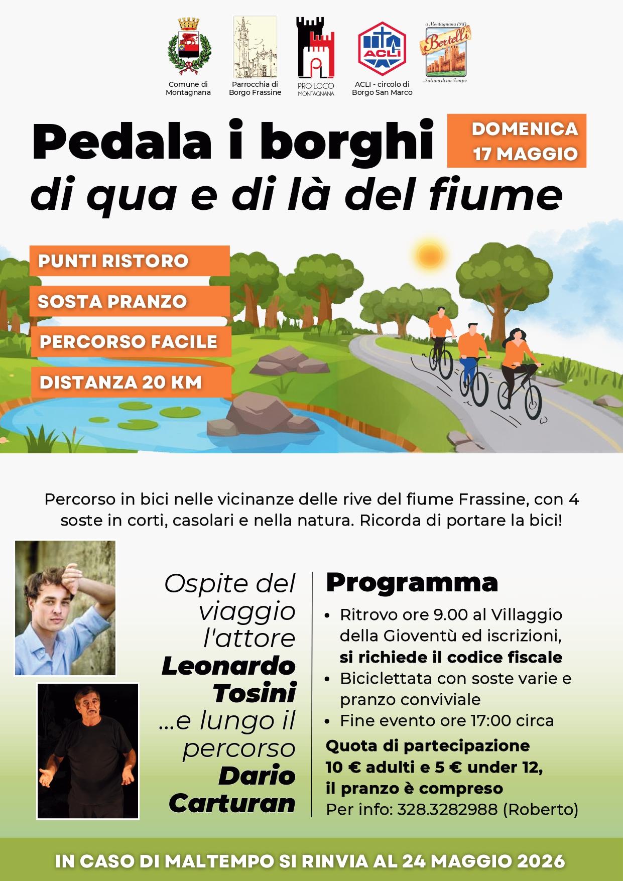 Appuntamento alle ore 9.00 presso il Villaggio della Gioventù, biciclettata con soste varie e pranzo conviviale. Fine evento alle 17.00 circa. Ospite del viaggio l'attore Leonardo Tosini, lungo il percorso Dario Carturan.