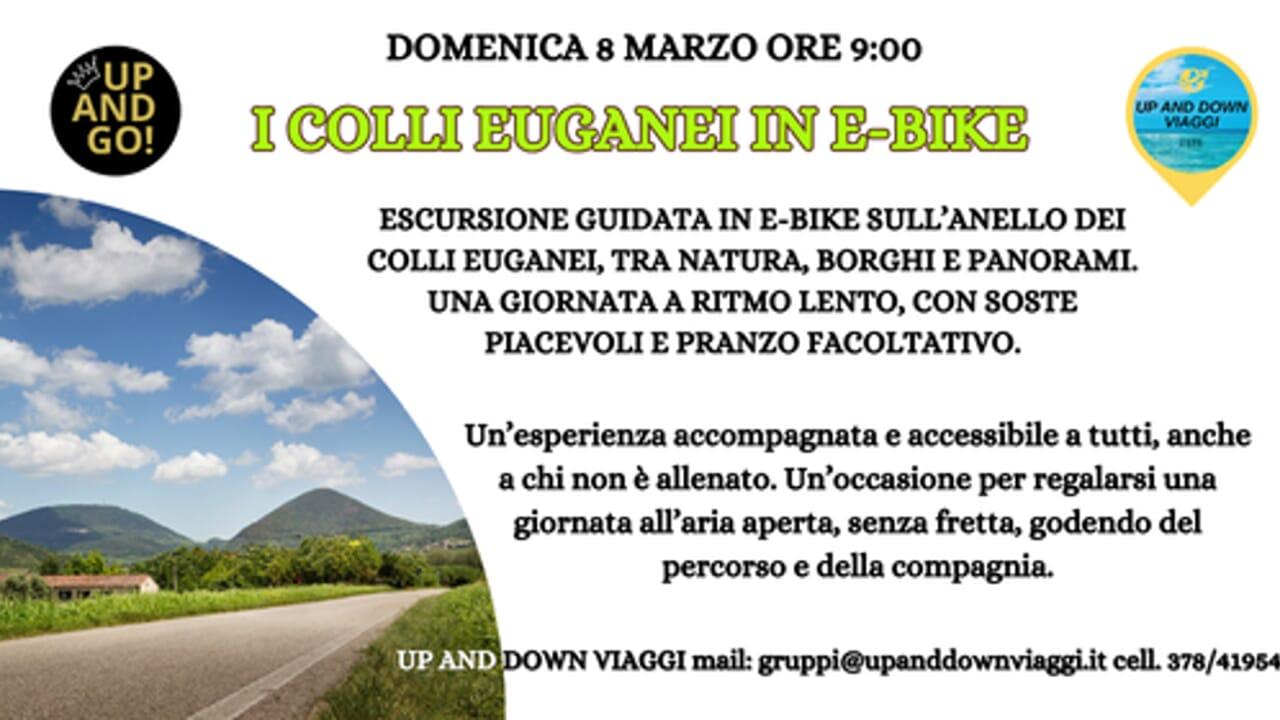 Escursione guidata in e‑bike lungo l’Anello dei Colli Euganei, un percorso panoramico tra natura, borghi e colline vulcaniche. Partenza da Baone alle 9:00 e rientro previsto verso le 17:00, con andatura tranquilla adatta anche ai meno allenati.