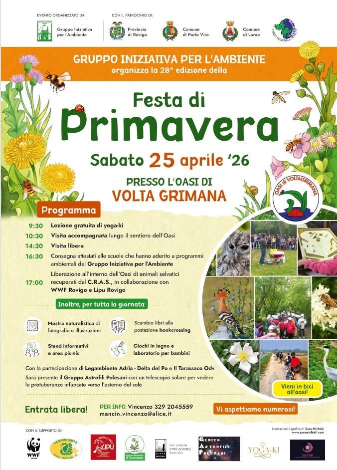 La Festa di Primavera 2026 torna con la sua 28ª edizione presso l’Oasi di Volta Grimana, un’area naturalistica di grande valore nel territorio del Delta del Po. L’evento, promosso dal Gruppo Iniziativa per l’Ambiente con il patrocinio della Provincia di Rovigo e dei Comuni di Porto Viro e Loreo, rappresenta un’importante occasione di incontro tra natura, cultura e sostenibilità.