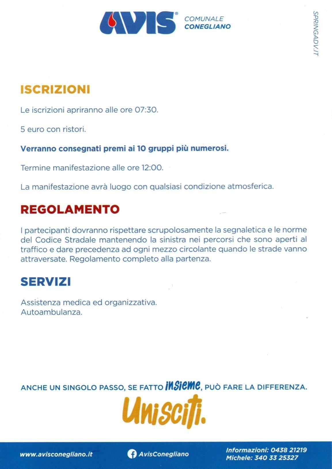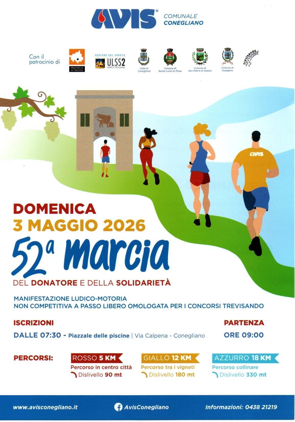 AVIS Comunale Conegliano organizza per domenica 3 maggio la 52esima Marcia del Donatore e della Solidarietà, una manifestazione ludico-motoria non competitiva e a passo libero, omologata per i concorsi Trevisando.