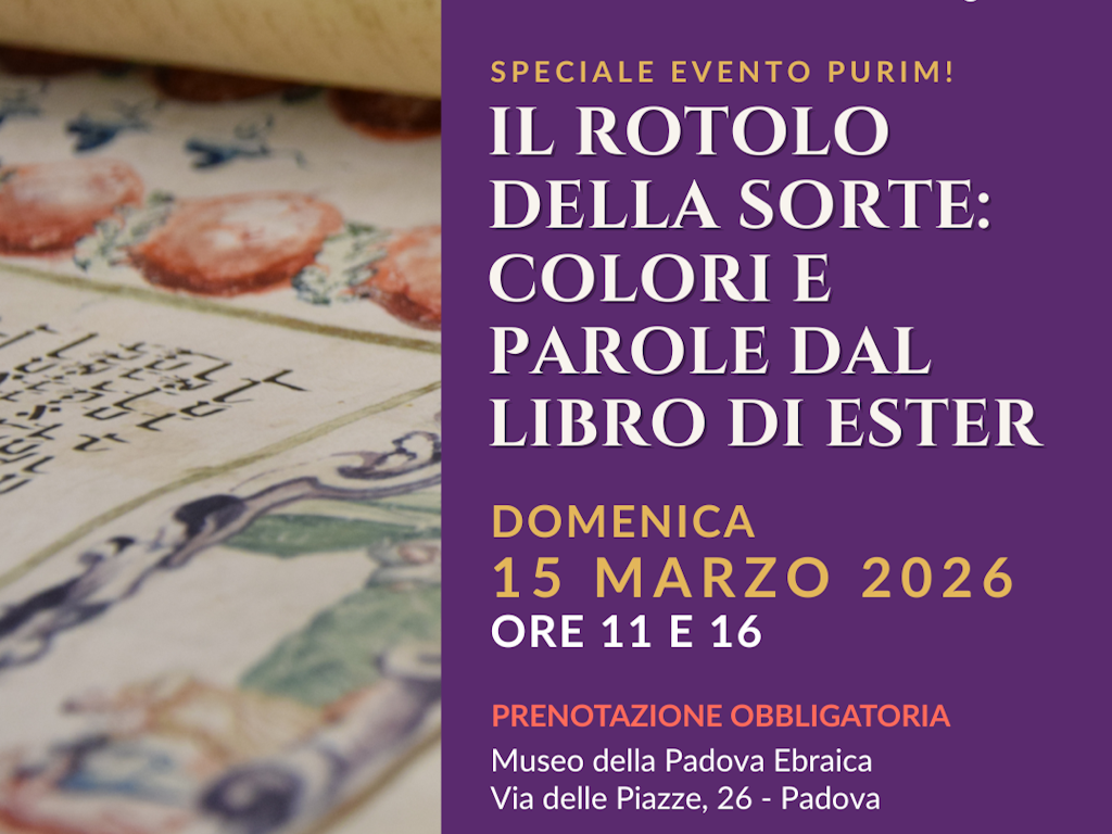 Il Museo racconterà il prezioso rotolo padovano del Settecento per accompagnarti alla scoperta della storia della Regina Ester: un racconto di coraggio, destino e salvezza che ancora oggi parla al presente. Attraverso immagini, simboli e parole approfondiremo la ricorrenza di Purim, per comprenderne i significati più profondi e le tradizioni che la rendono unica.