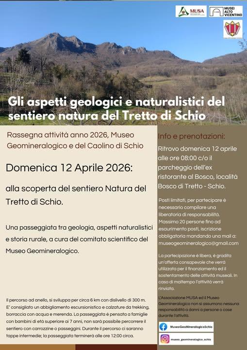 Domenica 12 aprile 2026 alle ore 8.00 partità da località Bosco di Tretto a Schio, la passeggiata Alla scoperta del sentiero Natura del Tretto di Schio, a cura del comitato scientifico del Museo Geomineralogico e del Caolino di Schio, in collaborazione con l'Associazione Musa, in collaborazione con Musei Alto Vicentino.