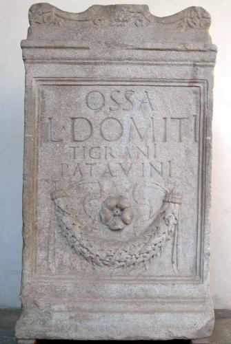 Ara funeraria, sopra la quale è steso un pulvino a volute decorato a rosette. L'iscrizione è inserita in un riquadro corniciato; sotto di essa una corolla e un festone. Ai piedi uno zoccolo.