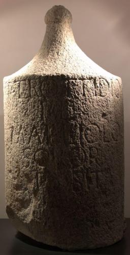 Cippo ossuario cilindrico a fusto liscio, martellinato, con copertura a cuspide conica liscia terminante con una sfera schiacciata. Era fissato alla base, non recuperata, con grappe, di cui restano alloggiamenti.