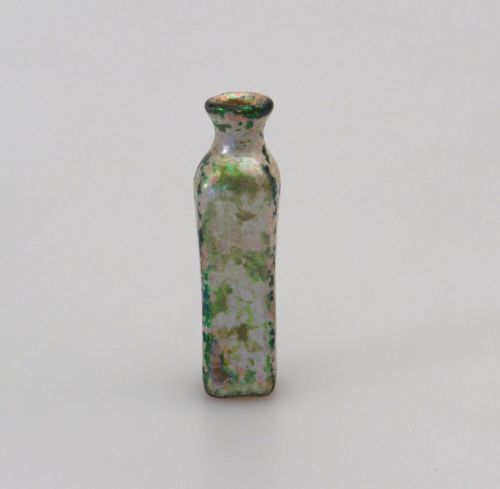 orlo tagliato e arrotondato, breve collo inclinato verso l?esterno, spalla arrotondata, ventre a sezione quadrata, leggermente rastremato verso il basso, fondo concavo