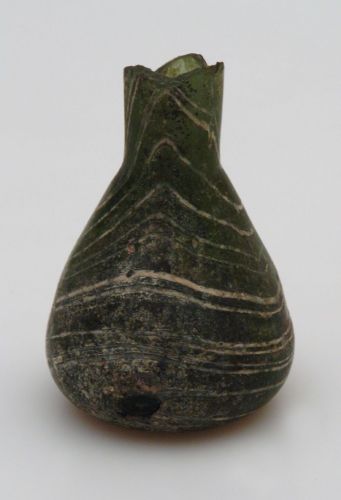 vetro verde scuro con filamenti bianchi a spirale/ soffiatura libera