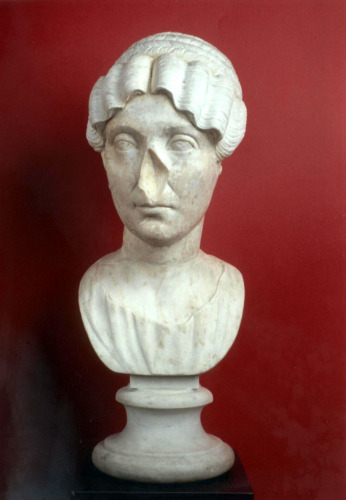 Ritratto femminile raffigurante una donna non più giovane. Il volto è ovale, gli occhi grandi, la bocca piccole e la fronte alta. Nonostante il restauro, la parte superstite dei capelli suggerisce una disposizione a bande ondulate pettinate verso le tempie e raccolte poi in una treccia sulla sommità del capo.