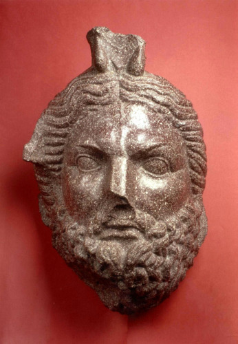 Il mascherone apparteneva a uno dei grandi bacini (labra) porfiretici che facevano parte dell'arredo delle terme di Caracalla. Essa ornava la parte inferiore di un'ansa appartenente a una vasca circolare di grandi dimensioni molto simile a un bacino parte della collezione Farnese, oggi al Museo Nazionale di Napoli. La testa potrebbe rappresentare una divinità legata al mondo egizio, una personificazione fluviale (il Nilo?) oppure Serapide.
