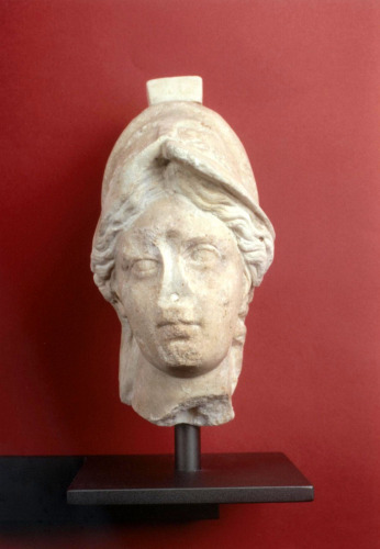 Elmo e acconciatura consentono di inserire la testa nella tradizione iconografica di Atena giovanile, stante e con l'elmo corinzio posato sul capo, dipendente da un prototipo classico come la cd. Atena di Velletri, oggi al Louvre. Si tratta però di una delle numerose rielaborazioni ellenistiche di questo modello, come dimostrano il tipo di elmo e il ricciolo sulla guancia.