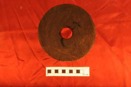 Elemento circolare di medie dimensioni, con foro passante centrale e profilo scanalato. Le superfici delle facce superiore ed inferiore si presentano in ottimo stato di conservazione.