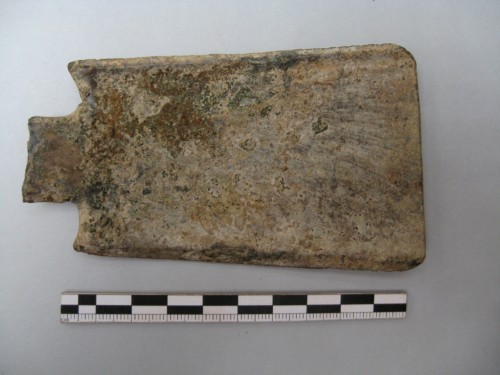 Paletta con lama trapezoidale a margini rilevati e angoli arrotondati; si conserva solo la parte superiore del manico a nastro.