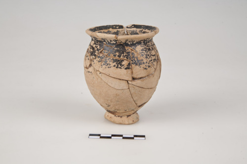 Bicchiere con corpo ovoide, orlo arrotondato, breve labbro rettilineo, svasato, piccolo piede ad echino con fondo esterno concavo.