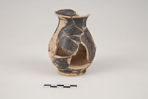 L'argilla è di colore beige arancio, la vernice è nero-bruna, opaca, diluita. Tracce di impronte digitali (vernice risparmiata) sulla parte inferiore del ventre.